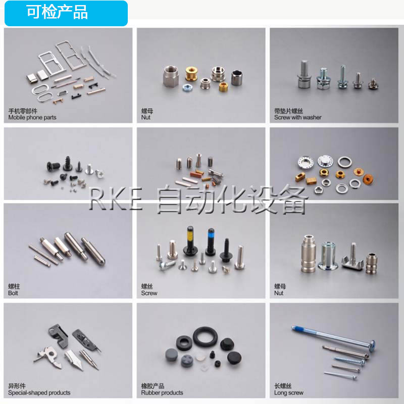 2、檢測的范圍:螺絲、螺母、汽車配件、手機零配件、航空件、塑膠件、磁芯產品、表面缺陷、外觀尺寸、連接器、沖壓件、字符等等,都是可以進行檢測篩選的。